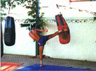 in linea bassa e media del corpo (calci tirati con le tibie), oltre alle ginocchiate e i colpi di gomito che possono essere portati anche al viso.